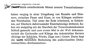 wie der ausländischen) rechnen, daß: man Ton auf Film nur unter den speziellen Bedingungen eines abgeschirmten Ateliers aufzeichnen könnte und müßte; man auf Film nur künstlich reproduzierbare Töne aufzeichnen könnte und müßte; es unmöglich sei, dokumentarische (im besonderen Außen-) Tonaufnahmen herzustellen. Zur zweiten Gruppe besonderer Hindernisse (nennen wir sie die »Gruppe der Starrheiten«) muß man rechnen: die völlige Starrheit der (gewissermaßen in die vier Wände des Ateliers eingemauerten) Tonaufnahmeapparatur; die Starrheit der Bildkamera, die mit »kurzer Kette« an die Tonaufnahmeanlage geschmiedet war; die Starrheit des Mikrophons, das nicht einmal im Käfig des Ateliers während der Aufnahme bewegt werden durfte. (S. 122) |